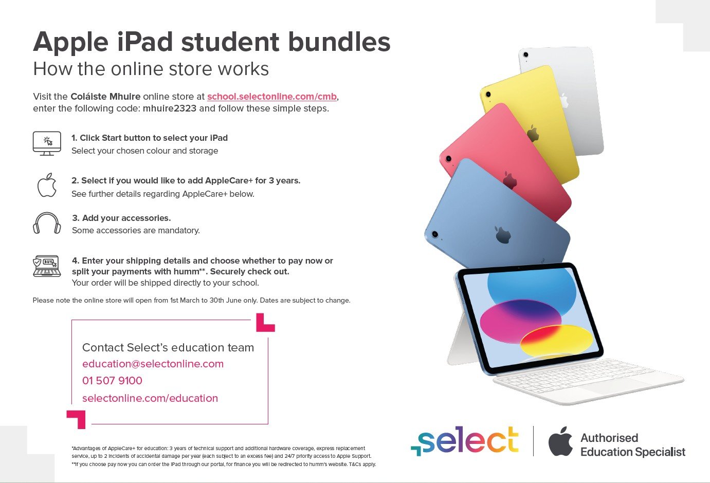 Thank you for attending our iPad information event on Thursday 26th April. We hope you found the event useful and informative. For those of you who may have missed the event, all relevant information is available here. Many of you already have children attending the school and know how the system works. For those of you who are less familiar, a step by step guide on how to access and use the Select online store is posted in the flyer below. The store is now open and is created specifically for Coláiste Mhuire students and parents. The store will close on Friday 6th June 26. The link to the store is https://school.selectonline.com/access/code/login/school/cmb/ and the Coláiste specific password to access that store is mhuire2323 . Details are also contained in the flyer below. As mentioned at the iPad info meeting, this year the school will purchase the case for all incoming 1st years who purchase an iPad from SELECT which is a saving of €40. Therefore, the only item you need to purchase from the online store is the iPad bundle itself.