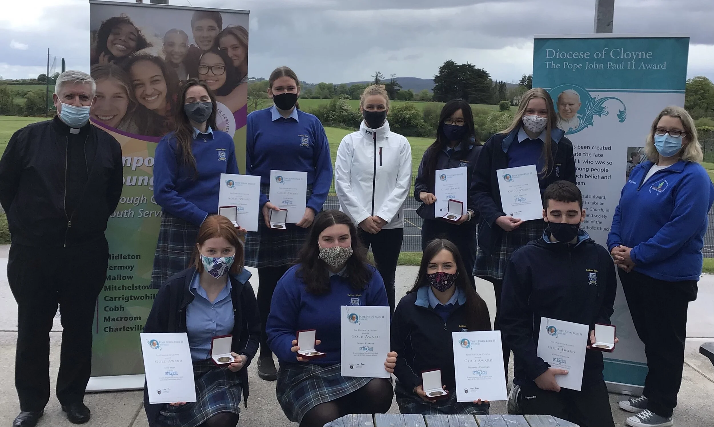 A very huge congratulations to nine of our 5th years on receiving their Gold Pope John Paul II Awards this week! Missing here is Caitriona Carroll, but together with Joni Ryan, Gabriela O Keeffe, Anna Salvin, Sophie Perrott, Cathal Duggan, Michaela O Donovan, Niamh McGiff, and Kelly Jamieson, they each gave two hours a week for 20 weeks to a vast array of Parish and Social activities, changing mid way to accommodate Covid restrictions. These students got groceries and did household jobs for the elderly, they were part of the school Junior Pastoral Council, they fundraised for charities including St. V.DeP at the church gate, visited and volunteered in nursing homes, became stewards and readers at Mass, volunteered with teaching kids dance, participated in a debating competition run by the Knights of Columbanus, amongst many more Covid safe activities!